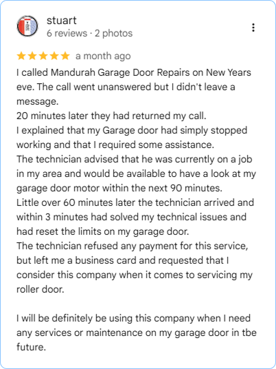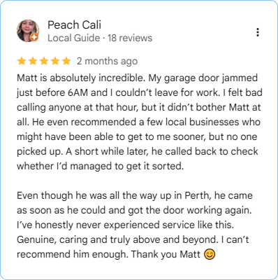 Mandurah Garage Door Repairs has been looking after local homeowners for over 15 years. What started as a dedicated garage door repair service has grown into a full-service operation covering everything from emergency motor repairs to brand new door installations.