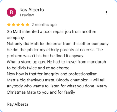 We're based here. We live here. When you call us, you're talking to the people who actually do the work, not a call centre booking jobs on behalf of a company that doesn't know Mandurah from Melbourne. You'll know who's coming, and they'll be at your door today.
